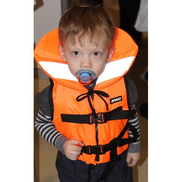 Детский спасательный жилет "Юнга-М" предназначен для детей весом до 20 кг. По возрасту подходит детям от 1 до 3 лет. Жилет оборудован удобным подголовником для поддержания головы на воде. В походном положении подголовник не мешает ребенку. Под подголовником расположена петля для удобной и быстрой подтяжки ребенка к себе. Застегивается жилет на замок-молнию и 2 ремня с фастексами, двумя шнурками на воротнике и снизу жилета. Для того, чтобы при падении в воду, жилет не слетел с ребенка - он оборудован паховой стропой. Для хорошей видимости в темное время суток на плечах и подголовнике расположены светоотражающие полосы. Спинка наполнена наполовину. В районе поясницы жилет пустой, в районе лопаток - с наполнителем. Данное расположение наполнителя гарантирует точное положенние ребенка в воде лицом вверх.